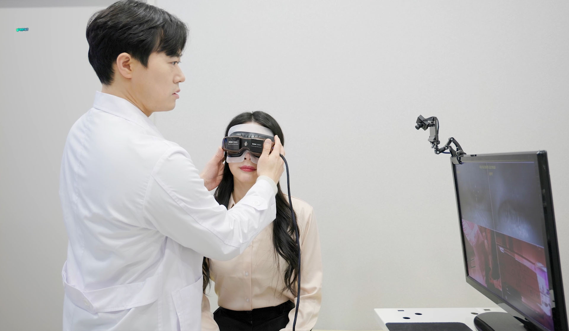 환자가 고글처럼 생긴 안경을 착용한 상태에서 의료진이