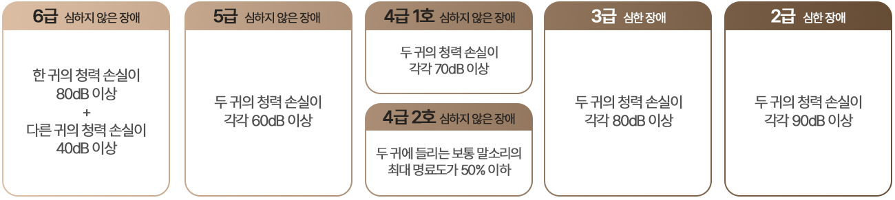 6급, 5급, 4급 1호와 4급 2호는 심하지 않은 장애로, 3급과 2급은 심한 장애로 분류됩니다.